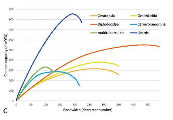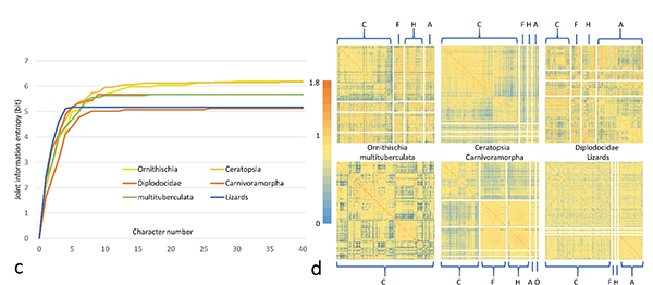 该研究首先计算了多个脊椎动物形态学特征矩阵中每个特征的信息熵(信息量),拥有更多特征状态的特征有明显较高的信息熵。对于矩阵中多个特征的联合信息熵的结果显示仅仅少数形态学特征即可描述信源信息熵,绝大多数特征并没有提供额外的信息。这与古脊椎动物学研究中报道新物种的习惯符合,即利用少数特征作为鉴定特征,而在系统发育研究中则会使用数量大得多的特征。类似地,这样的区别可以用通信系统工程当中的信源与信道编码过程解释。进一步地,研究计算了每个特征矩阵中特征对之间的互信息,发现特征之间的相关性广泛存在,但习惯上对于解剖结构的划分并没有体现出较好的模块性。