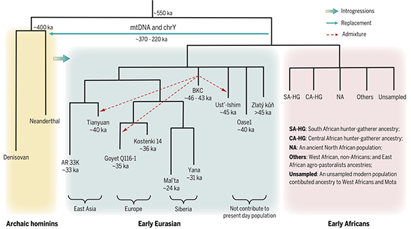 在欧亚地区分布的早期现代人群存在多个支系。有些人群对现代的人群没有可检测到的遗传贡献,还有些人群和现代的人群有关。发现于西伯利亚中部的约4万5千年的Ust'-Ishim个体、发现于捷克的超过4万5千年的Zlaty kuň个体,以及发现于罗马尼亚的约4万年的Oase 1个体对当今人群没有可检测的遗传贡献;而在中国发现的田园洞人和AR33K个体、在比利时发现的Goyet Q116-1和俄罗斯发现的Kostenki 14个体、在俄罗斯发现的Mal’ta和Yana个体则分别代表了古东亚人,古欧洲人和古北西伯利亚人。随着时间的推移,这些人群发生交流、迁徙,形成更精细的人群结构。尽管我们对欧亚早期现代人群的认知还较为有限,但古DNA研究不断充实着这些人群历史的细节。比如2017年一项研究发现来自中国的田园洞人和远在比利时的GoyetQ116-1个体存在遗传联系。这个发现有些出人意料,因为一般来说,距离相隔较远的人群直接发生基因交流可能性不大,所以可能性更大的情况是,他们之间存在第三个人群,将两者联系了起来。四年之后,一项新发表的研究发现了一个生活在保加利亚的古老现代人群和两个人群都存在遗传联系,验证了之前的猜想。