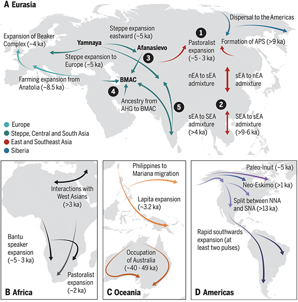 近万年来,气候变得温暖而稳定。全球出现了更为活跃的人群活动,包括快速的扩散、迁徙、互动和更替等。全球不同地区的人群呈现出不同的规律,有些地区以内部人群互动为主,呈现出长时间的人群连续性,比如东亚和澳大利亚;有些地区则出现了多次的人群混合和取代,比如欧洲和欧亚草原地区。这些世界范围的人群迁徙与互动,以及后续相关历史事件的影响,逐步形成了全球人群的大致格局。