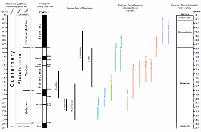 剑齿虎亚科(Machairodontinae)是欧亚大陆晚新生代最具代表性的大型食肉类动物。该亚科在中国的时代分布从晚中新世一直延续至中更新世。更新世时期中国的剑齿虎依然繁盛,包括两个常见类群:锯齿虎属(Homotherium)和巨颏虎属(Megantereon)。巨颏虎属的时代延续达200万年以上,地理分布范围广,从辽宁地区至广西地区均有发现。因此巨颏虎属在剑齿虎晚期演化和生物地层学方面均具有极大的潜在研究意义。