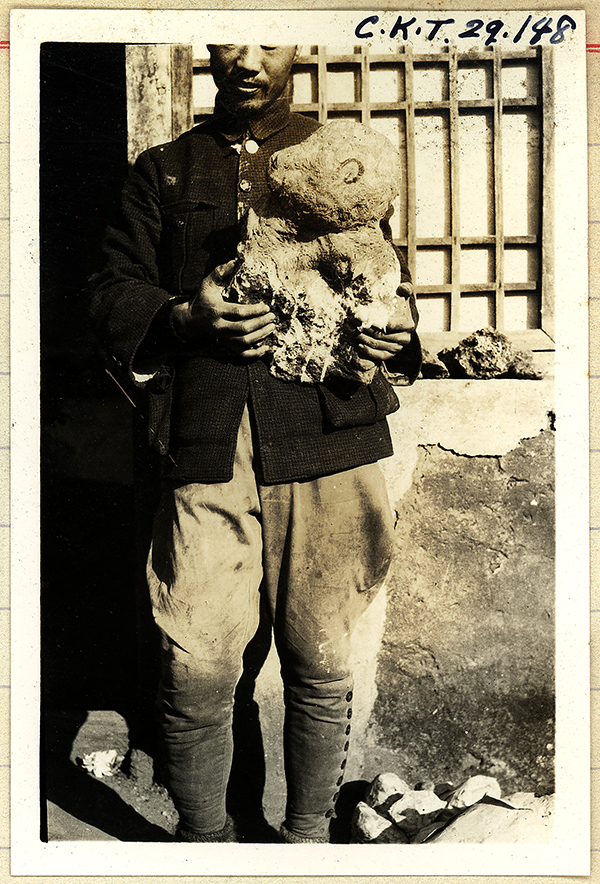 图2. 裴文中抱着经石膏加固后包裹好的头骨准备送往北京,王存义在拍摄时太注意头骨而忽略了裴文中先生的头。1929年12月3日王存义摄