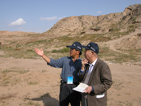 图9. 刘东生(右)在高星陪同(左)下考察水洞沟遗址