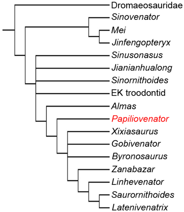 基于最简约原则的系统发育分析结果表明,目前发现所有的晚白垩世伤齿龙在伤齿龙科中构成一个较进步的单系类群,内蒙古蝶猎龙位于这个单系类群靠近基部的位置,仅比报道于蒙古国晚白垩世的阿尔马斯龙(Almas)要晚分异一些。阿尔马斯龙和蝶猎龙是已报道的晚白垩世伤齿龙科恐龙中仅有的短吻型代表,其头骨特征兼具更早期分异的早白垩世伤齿龙的基本轮廓和其它晚白垩世伤齿龙的细节骨骼特征。对比发现,戈壁盆地晚白垩世坎帕阶的伤齿龙在头部和前肢形态上有较大分异,表明这个时期有限地理区域内的伤齿龙在取食策略上可能已经展现出一定的差异性。内蒙古蝶猎龙的发现表明晚白垩世东北亚陆地生物群的多样性程度比之前认为的更高且更复杂,对理解近鸟类恐龙的演化模式以及东北亚晚白垩世的古生态和古环境历史具有重要意义。