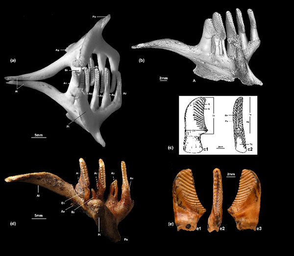 (a) 成年草鱼Ctenopharyngodon idella (CuvierValenciennes, 1844)的一对咽骨及其上的咽齿, 背侧视, 示原位咽齿, IVPP OV 2636, 前端向左; (b) 草鱼左侧咽骨及咽齿的3D显微断层扫描成像, 前侧视, 示两行咽齿, IVPP OV2636; (c) 一枚右侧主行咽齿的线条图, 示齿的构造, 分别为后视(c1)和背视(c2). 修改自张弥曼等(1985)(d) 大河村遗址出土的左侧咽喉骨具咽齿(A3除外), IVPP V 13714, 背视;(e) 左侧主行齿, IVPP V 2452, 前视(e1)、背视(e2)和后视(e3), 采自榆社.