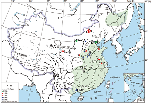 2 现代草鱼和草鱼咽齿化石分布图(序号1~22 表示类草鱼和草鱼咽齿化石的22个分布地点; 绿色阴影表示现代草鱼的天然分布区域)