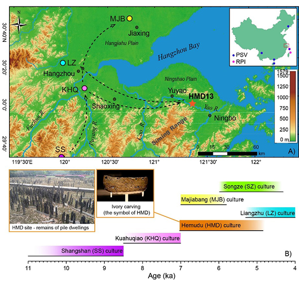 全新世以来,全球快速回暖,海平面上升,中国东部滨海地区地貌随之发生改变。气温升高,降雨大幅增加,使得陆地植被发育,生态环境变得优良,适宜农作物的生长和农业的发展。这为古人类在沿海地区繁荣发展奠定了基础。因此,海平面变化控制着东部滨海平原区新石器文化的时空分布(图1)。宁绍平原上的河姆渡文化中首次出现杆栏式建筑、漆器等制品,是新石器早期古人类文明发展中承上启下的阶段。因此,河姆渡地区是研究新石器时期人类、气候和生态系统相互作用的理想地区。