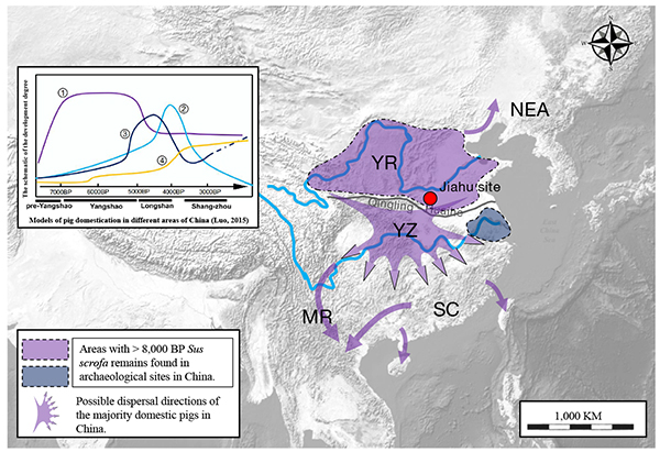 动物的成功驯化对人类社会发展具有里程碑式的意义,猪是最早被人类驯化的动物之一,在农业社会中发挥了重要作用,它也是研究动物驯化的重要“模式动物”。至少在1万到8千年前,家猪已在安纳托利亚地区和中国中原地区独立驯化。古DNA的研究已证实安纳托利亚的家猪在约8500年前随着新石器时代早期的农业人口进入欧洲,但进入欧洲的家猪不断与欧洲本地野猪混合,导致欧洲现生的家猪仅保留0-4%的近东祖源成份,显示出几乎完全替代的情况。而我们的研究发现,东亚的情况与欧洲完全不同。