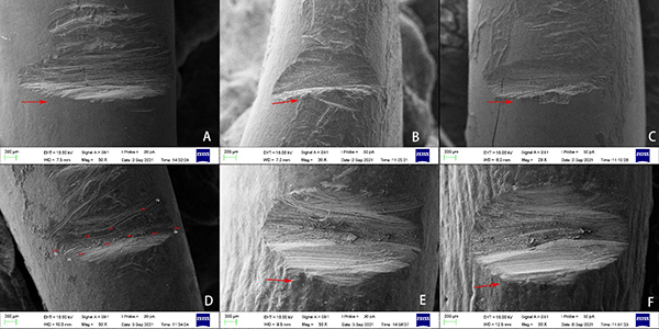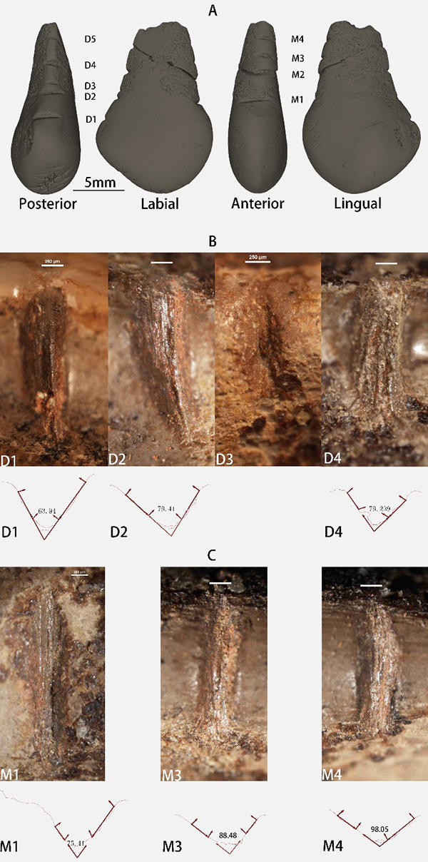 图2 (A) 齿根表面刻划纹的位置; (B) 齿根后侧刻划纹的形态及横截面角度(°); (C) 齿根前侧刻划纹的形态及横截面角度(°). 比例尺: (A) 5 mm, (B,C) 250 μm.