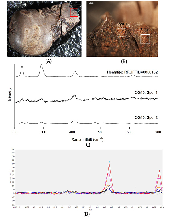 图4(A)和(B)鹿犬齿钻孔附近残留物取样位置;(C)拉曼分析曲线;(D)LIBS分析曲线.