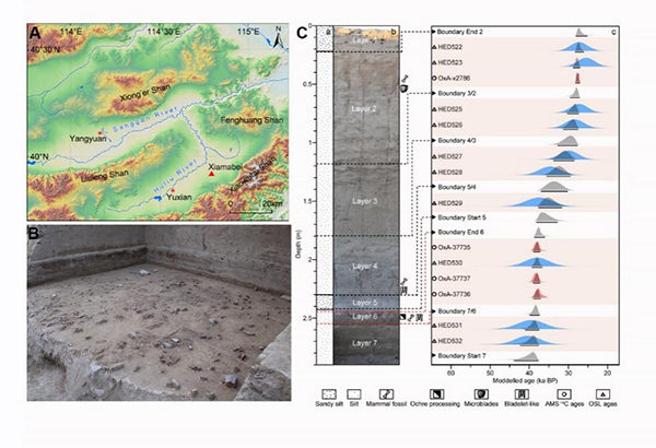 图1. 下马碑遗址的位置、地层与年代。A, 下马碑遗址在泥河湾盆地中的位置;B,下马碑遗址主文化层(#6)发掘面;C,遗址地层剖面及测年结果。(研究团队供图)