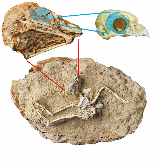 (蓝色覆盖处为巩膜骨,右边显示了现代鸺鹠类猫头鹰头眼眶中完整的巩膜环)