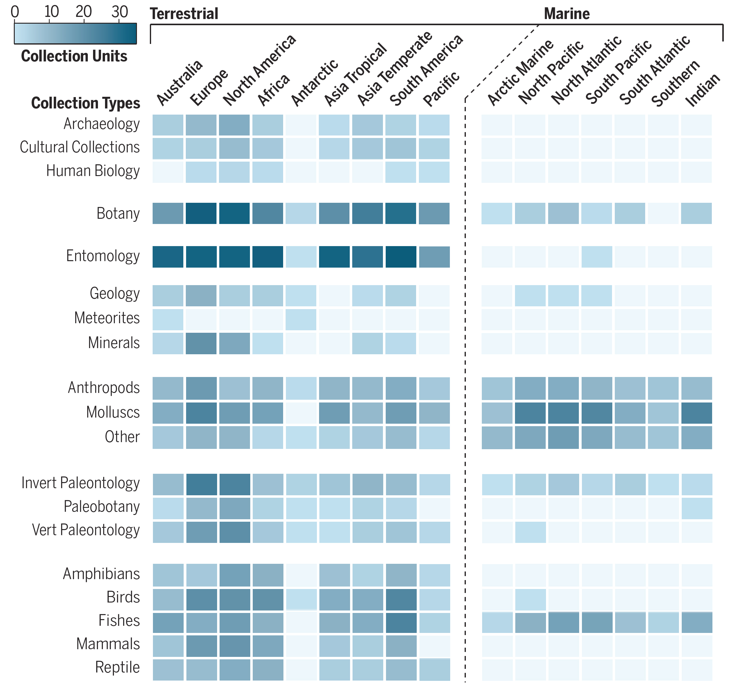 显示基于19种藏品类型和地球16个地理分区共304个网格中每个网格的藏品单元;“藏品单元”是指一个网格内的单一博物馆,如某家博物馆收藏有“亚洲温带/脊椎动物化石”网格的藏品,就是1个藏品单元;73家博物馆理论上应有22192个可能的藏品单元,本图仅包含1957个藏品数在1万件以上的藏品单元。