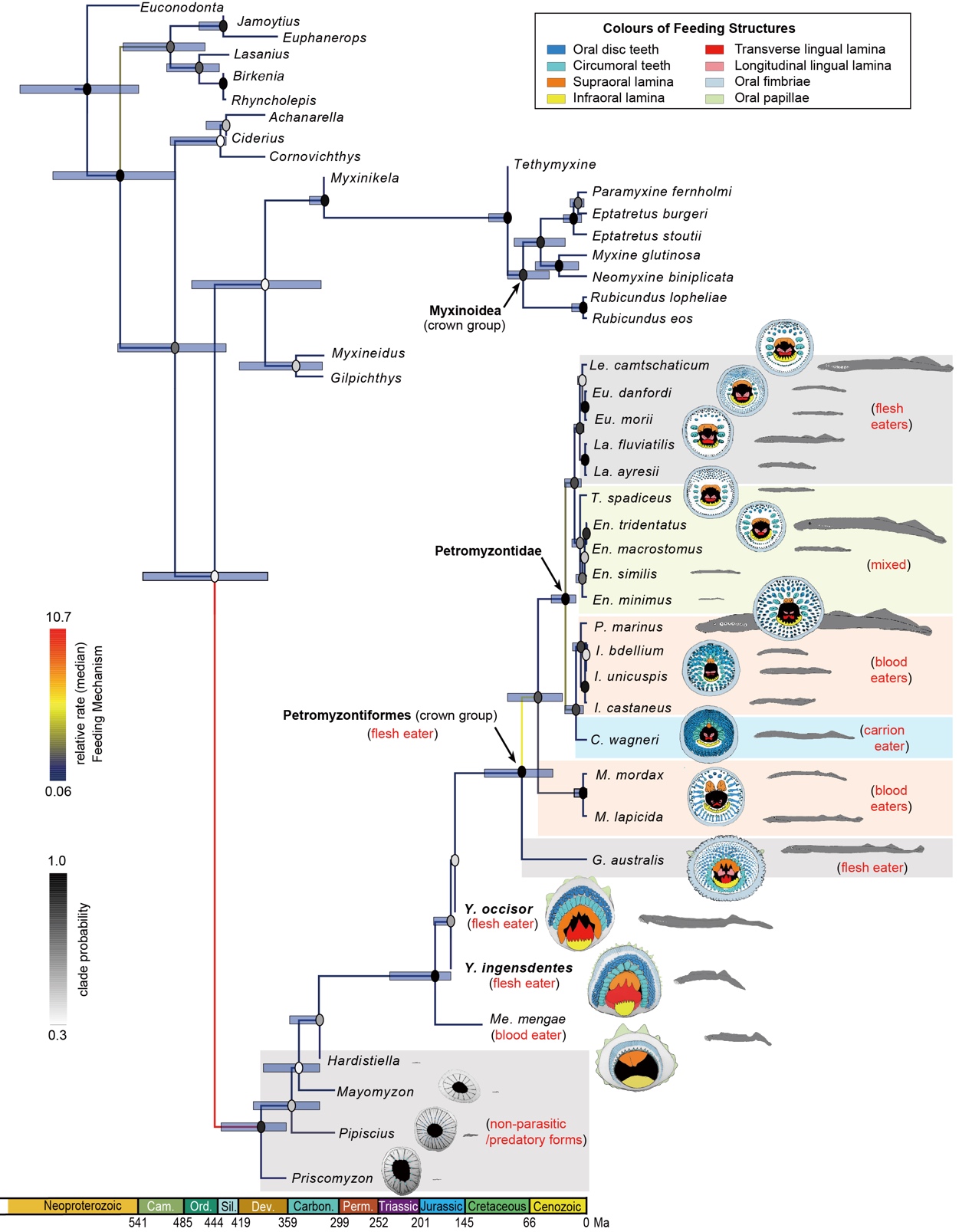 根据重构后的七鳃鳗家族时间(谱系)树(Timetree),研究者复原和推算了有化石记录以来,七鳃鳗摄食系统的演化过程及演化速率的变化。从摄食系统的演化来看,侏罗纪是七鳃鳗演化历史的“分水岭”。从侏罗纪开始,七鳃鳗的摄食系统和生态习性趋近现代七鳃鳗。与摄食系统演化同步的是七鳃鳗食物来源的变化。对比侏罗纪前后其他鱼类体表鳞片结构的演化,参照现代七鳃鳗体型(能量储存的多寡)和生活史类型的对应关系,研究推测,从早侏罗世开始,较进步的、鳞片变薄的真骨鱼类大量出现,为七鳃鳗提供大量食物来源,导致它们体型大增,进而促成了能量要求很高的现代型三段式生命史的出现。