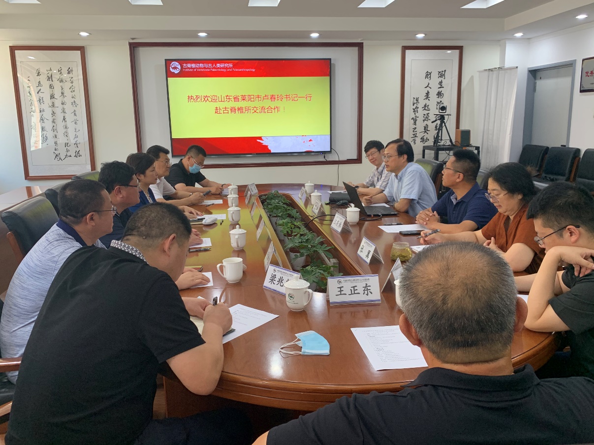 7月18日,山东省莱阳市委书记卢春玲、市委常委副市长宣传部长于涛、市委常委办公室主任蒋学庆等一行访问古脊椎所,商谈合作事宜。古脊椎所党委书记、所长邓涛主持会议,汪筱林研究员、科技处处长张翼、古动物馆馆长王原参加。
