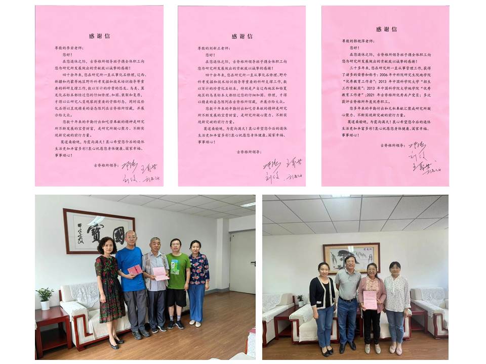 分管所领导邓涛所长、王秀琴副所长代表所领导班子分别给李岩、刘新正和郭艳萍送去了感谢信。感谢三位老师为研究所作出的独有的贡献,三位老师多年来的辛勤付出和吃苦奉献的精神是研究所不断发展的宝贵财富,是研究所凝心聚力、不断实现新突破的前行力量。莫道桑榆晚,为霞尚满天!衷心希望三位老师的退休生活更加丰富多彩!衷心祝愿三位老师身体健康、阖家幸福、事事顺心!