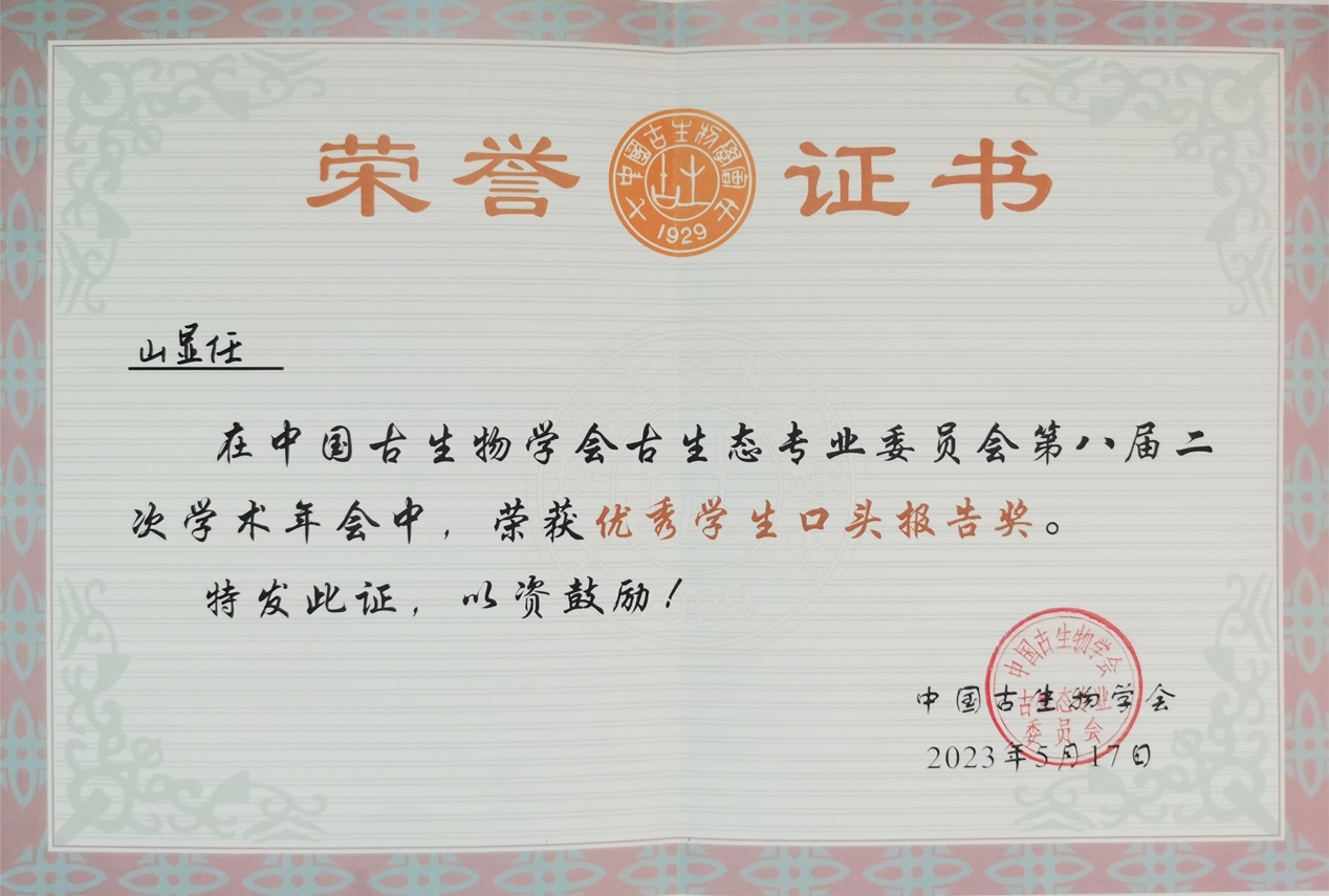 为促进年轻人才培养,本次会议特针对参会学生代表设立5个优秀报告奖。我所硕士研究生山显任(导师:赵文金研究员;副导师:盖志琨研究员)在此次学术年会上作了题为“中国志留系下红层的古鱼类化石及其古动物地理”的学术报告,重点介绍了我所早期脊椎动物演化研究课题组在中国志留系下红层中新发现的古鱼类化石及其在生物地层学和古动物地理学方面的重要意义。经与会专委会理事认真评审,山显任同学的学术报告荣获了本次学术年会的“优秀学生口头报告奖”。