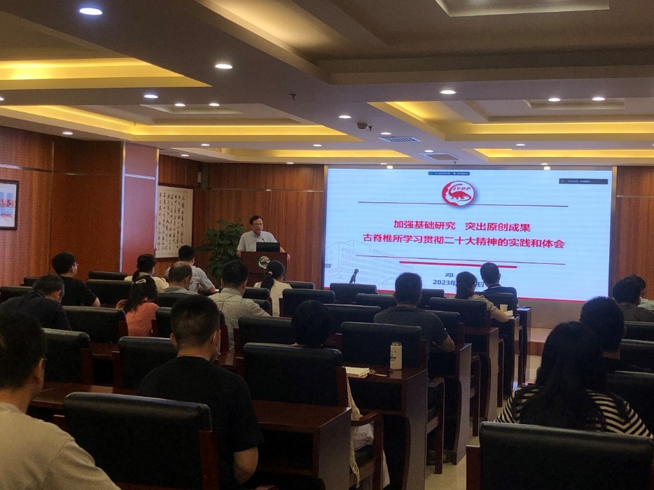 邓涛传达了院党的建设工作会议精神并为全所党员讲了题为《加强基础研究 突出原创成果-古脊椎所学习贯彻二十大精神的实践和体会》的专题党课。党课从使命驱动、加强基础研究、突出原创和鼓励自由探索四个方面梳理展现了古脊椎所为践行党的二十大精神开展的工作和取得的成绩,激励全体党员和职工以更加饱满的热情投身到工作岗位。