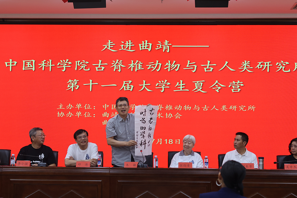 营长朱敏致辞中指出化石对于解释人类各器官如何演化而来至关重要,因为曲靖在早期脊椎动物演化研究中的重要性而选择在此举办本届夏令营,随后现场展示了他的书法作品,手录张弥曼院士的报告题目——“古老的化石,时尚的学科”,勉励大家积极投身古生物行业,并为营员代表授营旗。