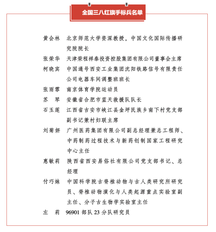 大会表彰了10名全国三八红旗手标兵、300名全国三八红旗手、200个全国三八红旗集体。我所付巧妹研究员获颁全国三八红旗手标兵荣誉及奖章。