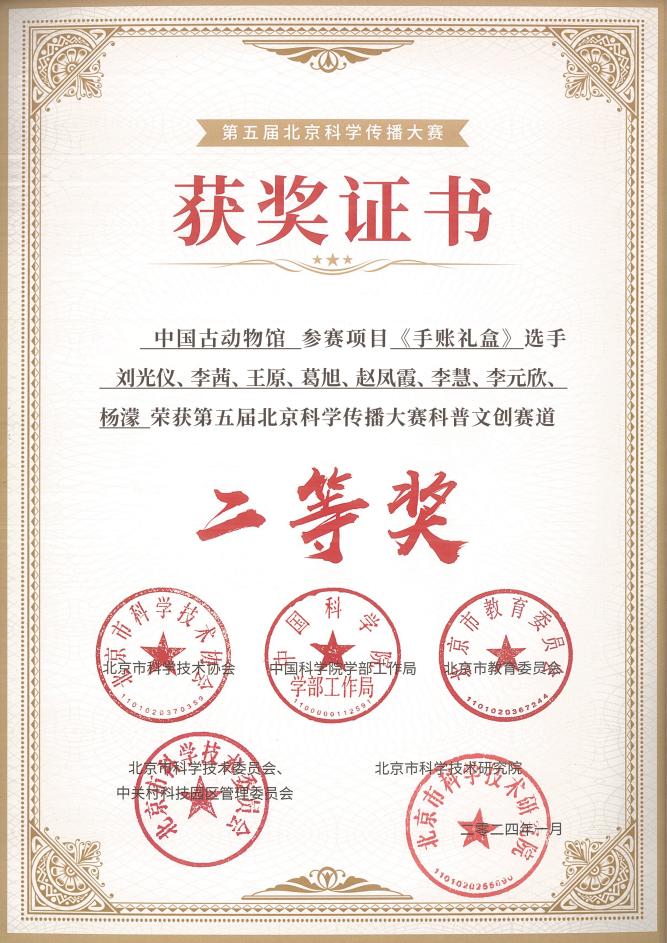 中国古动物馆兔年系列文创产品在第五届北京科学传播大赛中荣获科普文创二等奖。