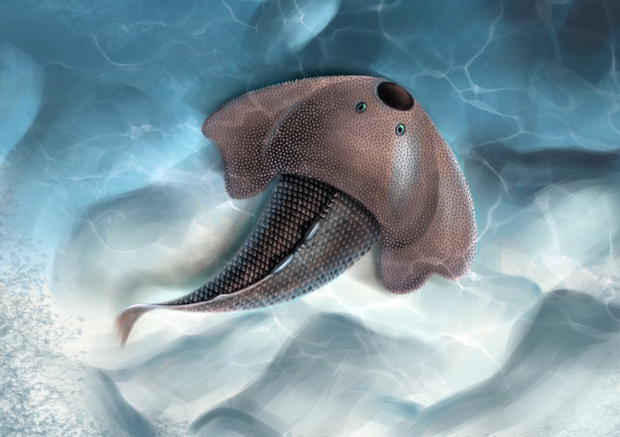 古脊椎所盖志琨团队发现4亿多年前的“甲胄鱼类”在系统分类上属于有颌类的基干类群,有效地记录了现生有颌类特征组合逐步演化的过程。通过对中国盔甲类和4.58亿年前奥陶纪显褶鱼(Eriptychius)等世界其他甲胄鱼类的系统梳理,建立了有颌类脑颅早期演化序列(Nature,2023);大庸鱼头甲内淋巴孔的发现,指示了脊椎动物开放的内淋巴管系统可能早在奥陶纪就已经出现,代表了有颌类的原始状态(Historical Biology,2023);在《国家科学评论》以封面文章,报道了在广西早泥盆世特异埋藏生物群中发现的首个完整保存尾鳍的盔甲鱼类——九尾狐甲鱼,研究表明:盔甲鱼类拥有典型的下歪尾,尾鳍还具有9个手指状的分叉,是原始的叉形尾,解决了盔甲鱼类头后身体解剖这一困扰学术界的百年难题。同期法国科学院院士Philippe Janvier 亮点评述文章评论说,新化石的发现最终证明了盔甲鱼类的尾鳍是下歪尾,与有颌类的上歪尾结构相反。从下歪尾到上歪尾的转变可能发生在奥陶纪时期,这无疑是脊椎动物演化史上一次重要革命。游泳速度分析结果表明盔甲鱼类是一类游泳能力较强的快速游泳者,它的巡航游泳速度甚至要比一些更进步的有颌鱼类还要快,从而否定了传统的“积极的捕食策略倾向导致有颌类起源”假说。