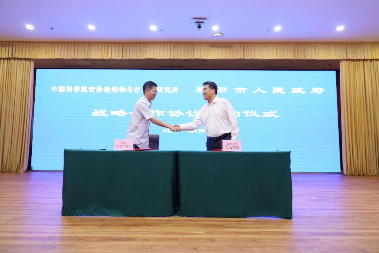 随后,古脊椎所与朝阳市人民政府签订战略合作协议的签订。此次交流对朝阳地区乃至我国古生物学领域的学术研究、化石保护与成果传播等方面具有重要意义,在讲好化石故事、打造特色文化品牌以及促进文化和旅游业融合发展等方面发挥更大作用。