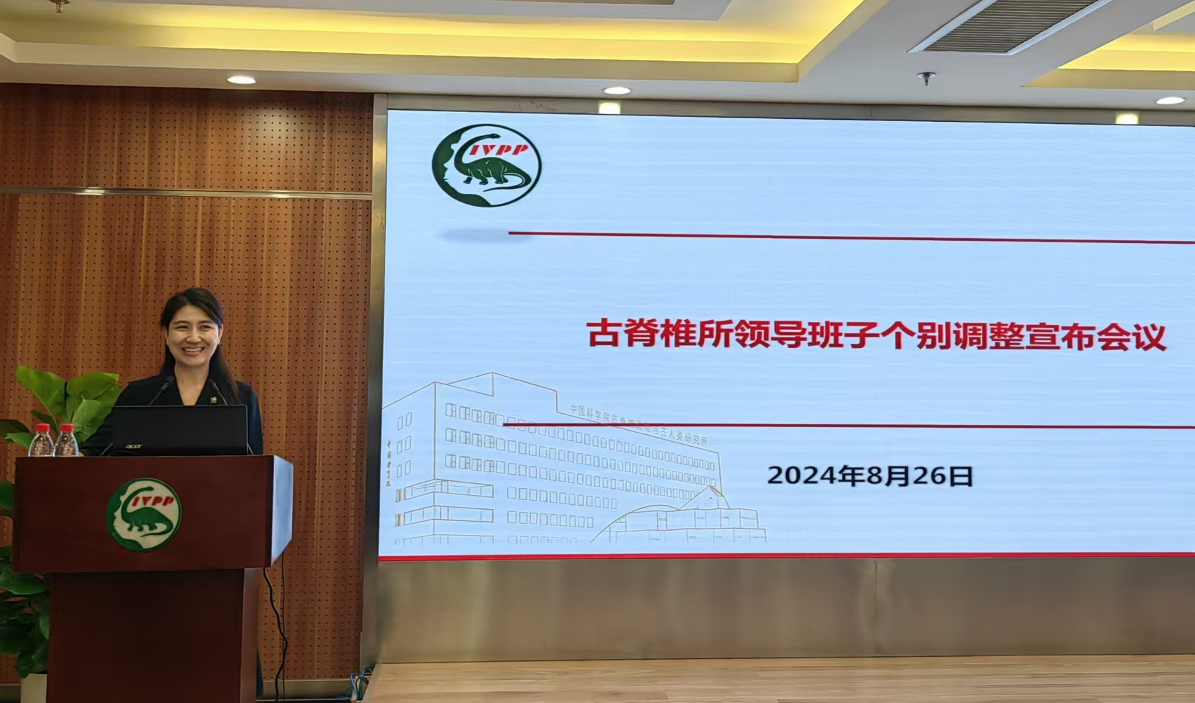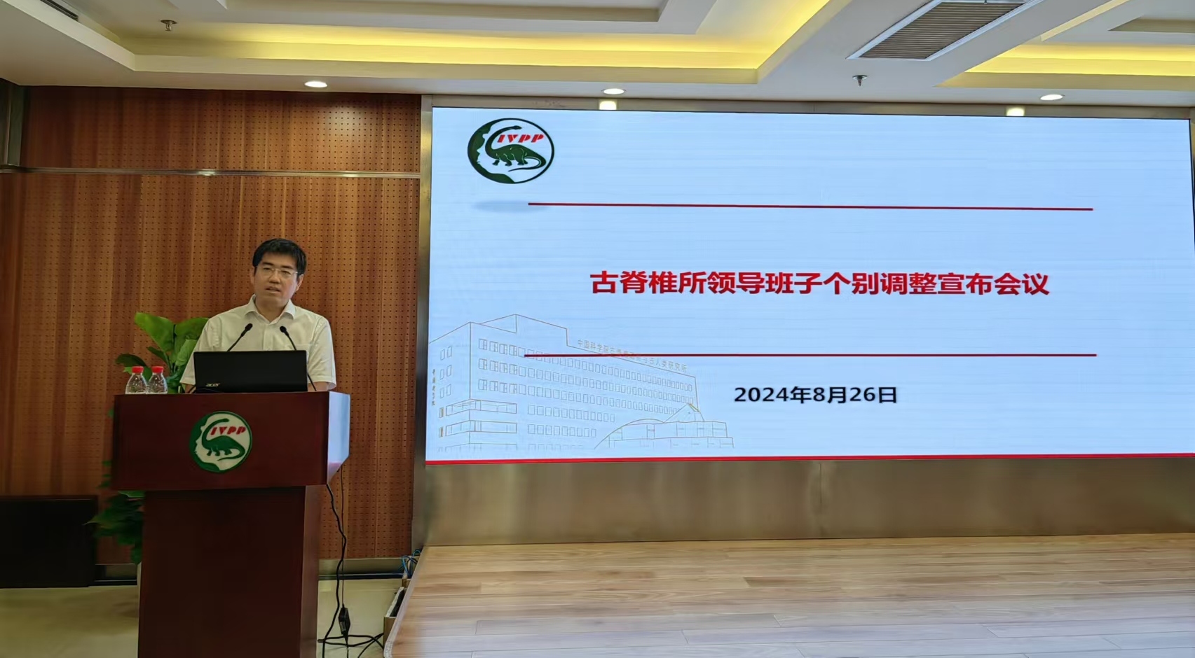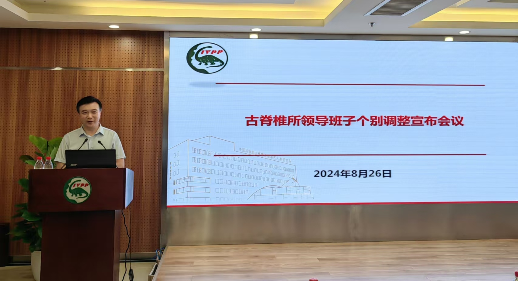 8月26日上午,古脊椎所召开领导班子个别调整宣布会议。中国科学院人事局副局长蔡宏志同志出席会议,领导干部二处副处长李熠熠同志,研究所领导班子成员、党委委员、纪委委员以及科研、支撑和管理骨干参加了会议。大会由党委书记、副所长刘俊同志主持。